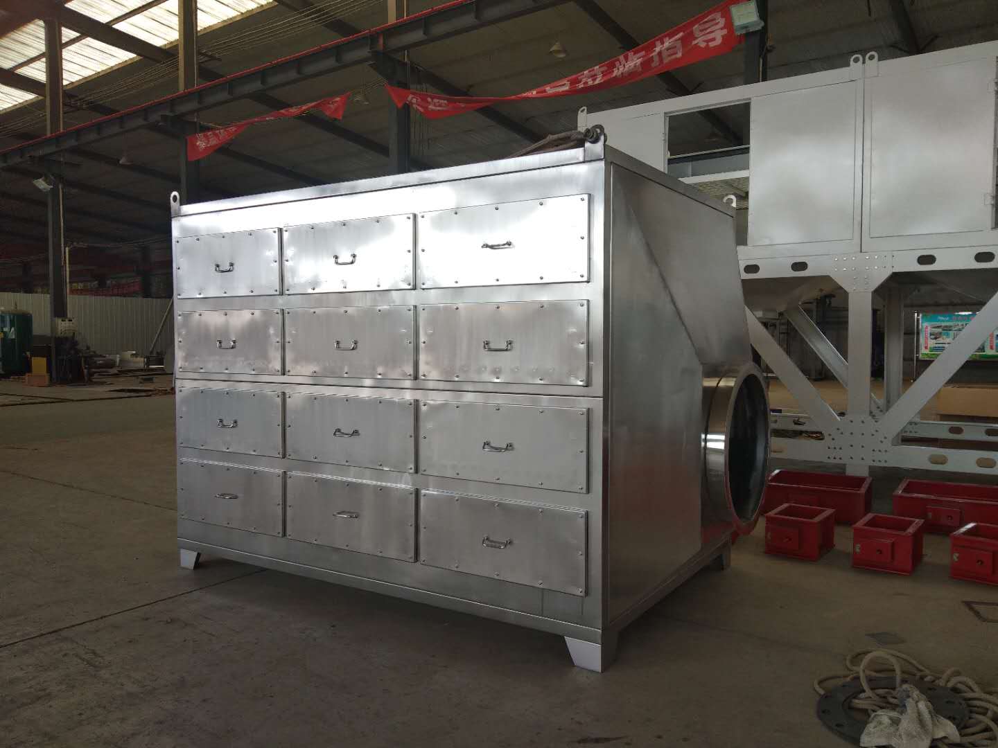 當(dāng)廢氣由風(fēng)機(jī)提供動(dòng)力,負(fù)壓進(jìn)入環(huán)保箱后進(jìn)入活性炭吸附層,由于活性炭吸附劑表面上存在著未平衡和未飽和的分子引力或化學(xué)鍵力,因此當(dāng)活性炭吸附劑的表面與氣體接觸時(shí),能吸引氣體分子,使其濃聚并保持在活性炭表面,此現(xiàn)象稱為吸附。利用活性炭吸附劑表面的吸附能力,使廢氣與大表面的多孔性活性炭吸附劑相接觸,廢氣中的污染物被吸附在活性炭表面上,使其與氣體混合物分離,凈化后的氣體高空排放;钚蕴凯h(huán)保箱是一種干式廢氣處理設(shè)備,由箱體和填裝在箱體內(nèi)的吸附單元組成。